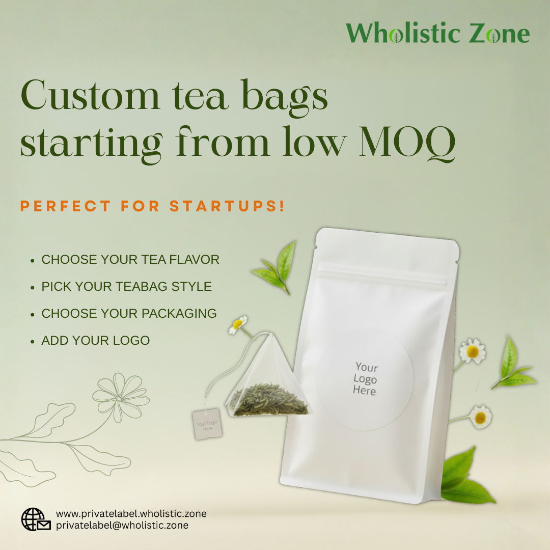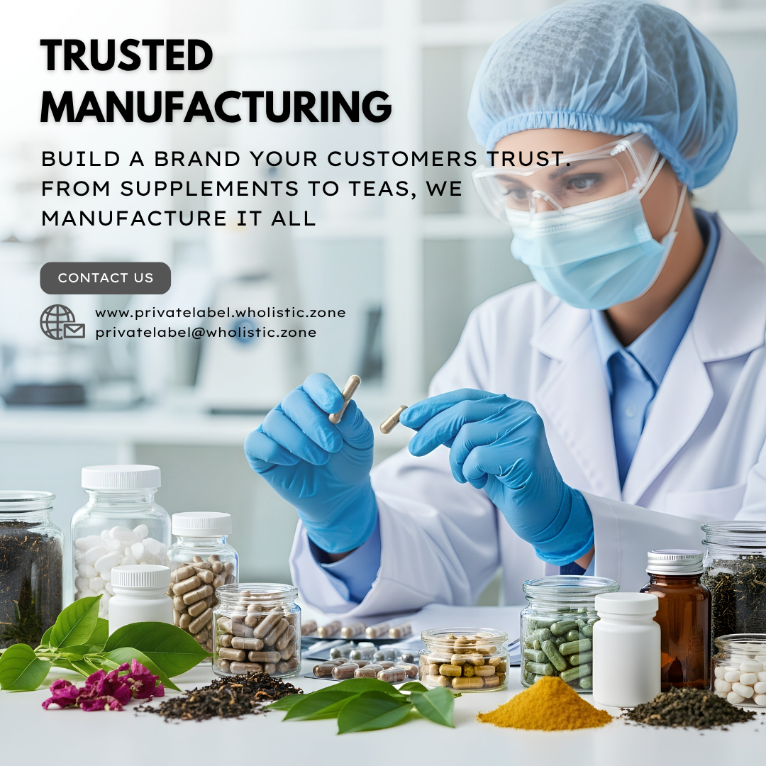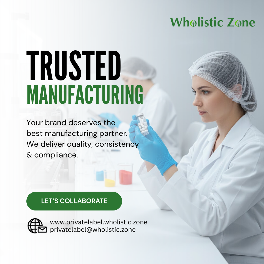 Wholistic Zone is a private label manufacturer specializing in supplements, herbal teas, nutraceuticals, beauty products, cosmetics, and essential oils. As a trusted contract manufacturer and white label supplier, we provide end-to-end services—including custom supplement formulation, capsule, gummy, powder, tea bag, and cosmetic manufacturing, along with packaging, label design, and R&D—delivering complete manufacturing solutions for wellness and beauty brands.